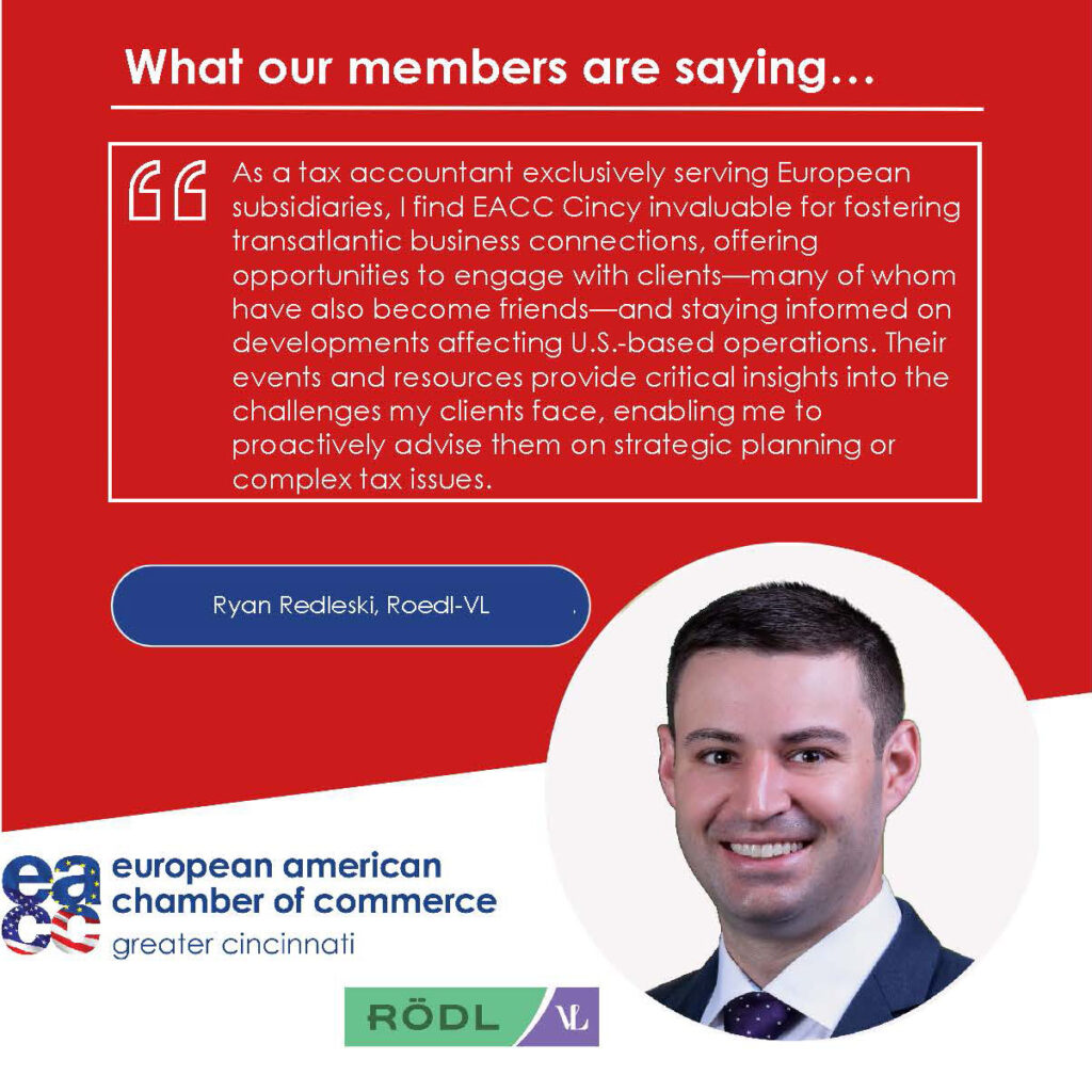 The European American Chamber of Commerce (EACC) of Greater Cincinnati creates business opportunities for our members by connecting them to our extensive European and American network and by providing strategic and relevant programming to help members grow. We are ‘Where Europeans and Americans Connect to do Business.’